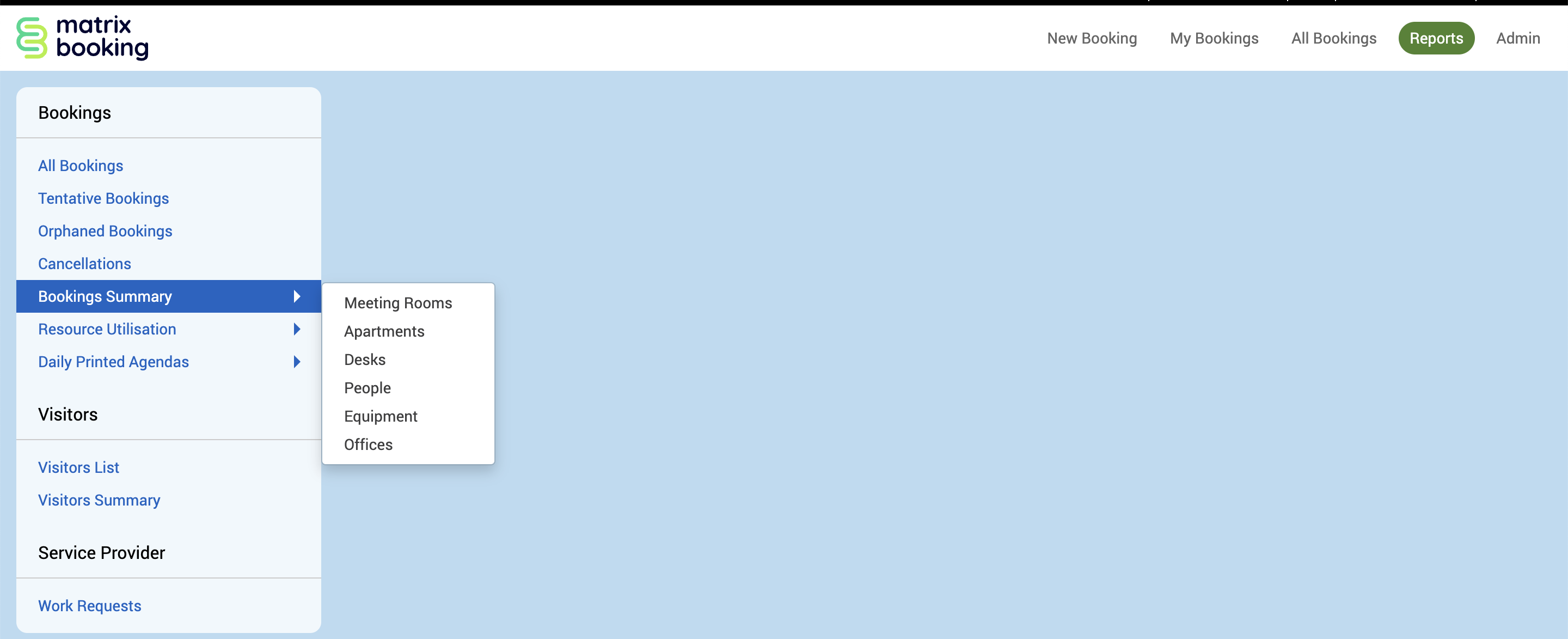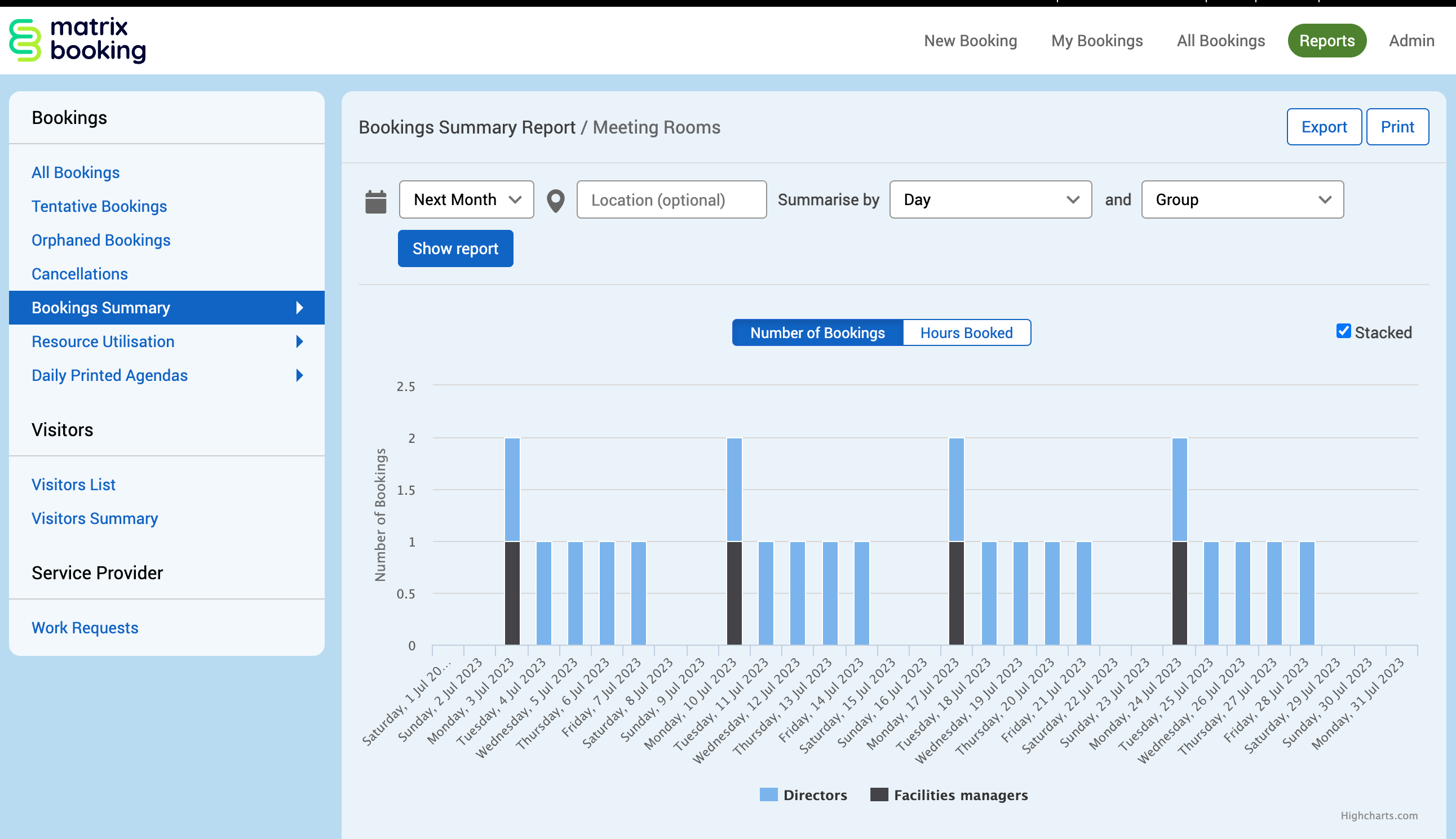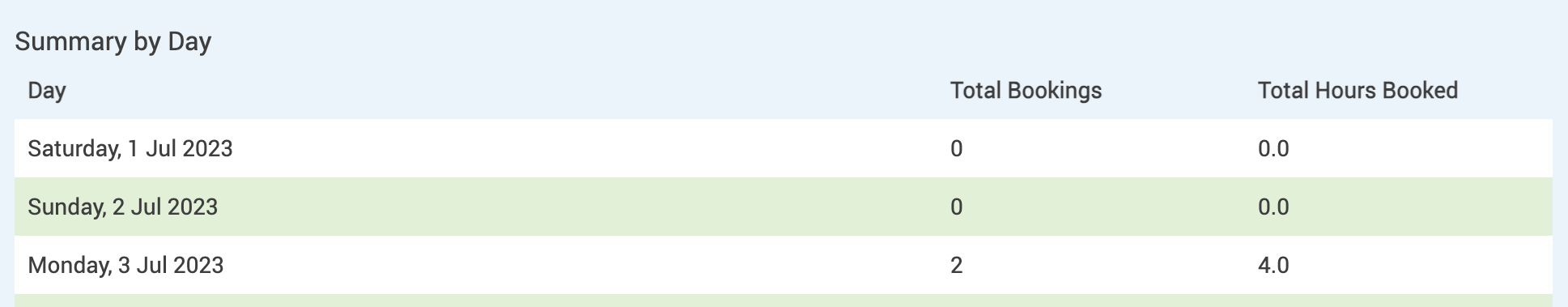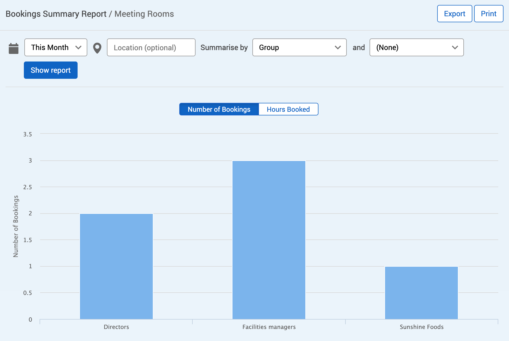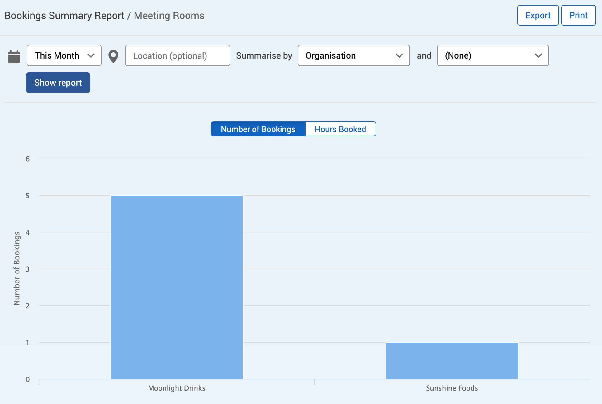 If you’re sharing resources with other organisations and you use the Summarise by Organisation report, the Bookings Summary report will return all of the data of all the organisations that have made bookings based on the time period and location you have used. You’ll see the total number of bookings or hours booked for: