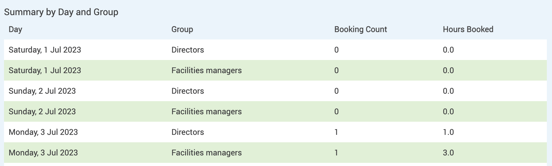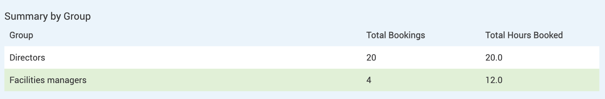 If you’re sharing resources with other organisations and use the Summarise by Group report, it will return all the data of all the organisations that have made bookings. The report will also take into account any other search parameters or filters that you’ve applied. You’ll see the total number of bookings or hours booked for: