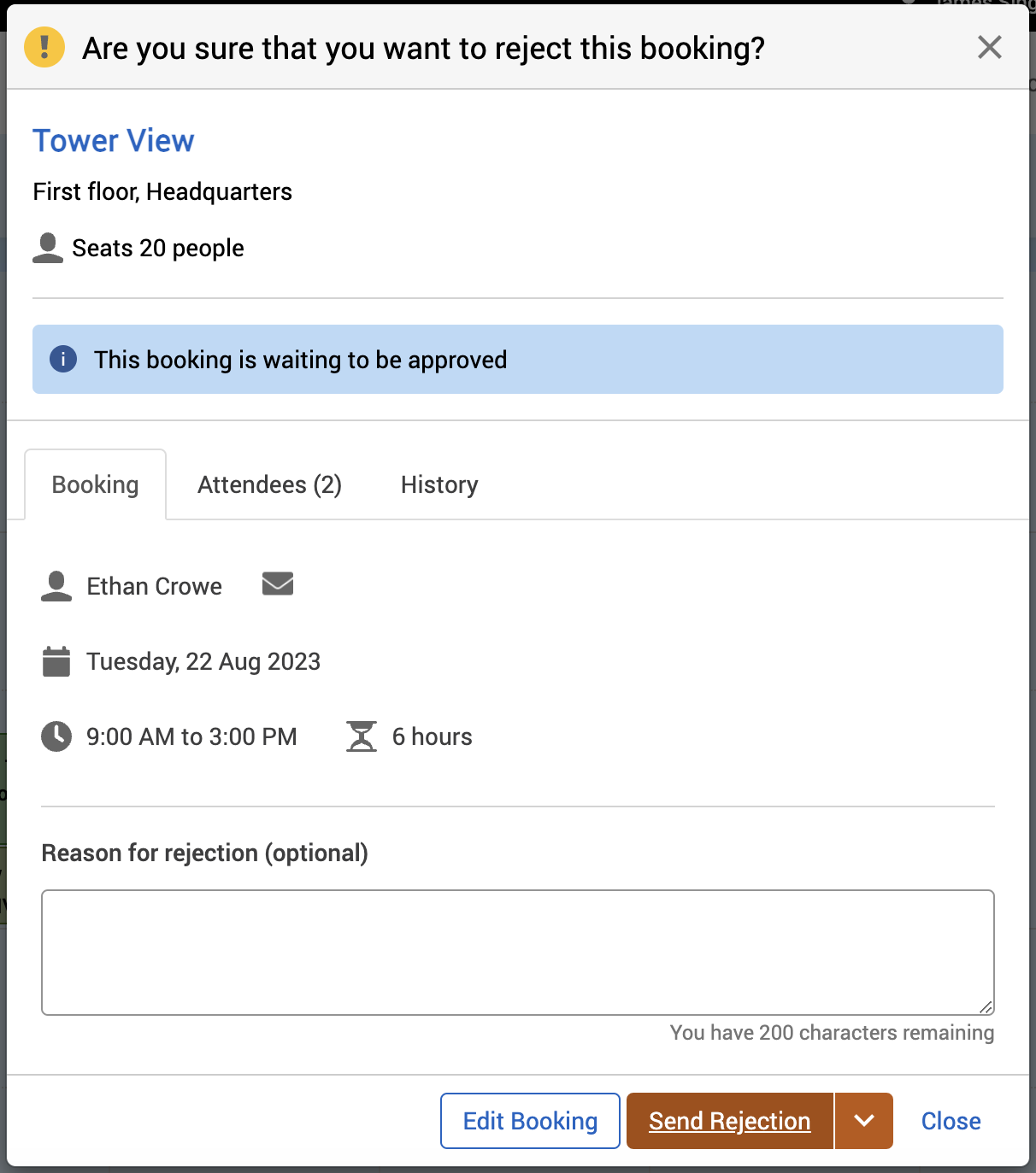 Add a reason for rejecting the booking in the Reason for rejection (optional) text box if you want.