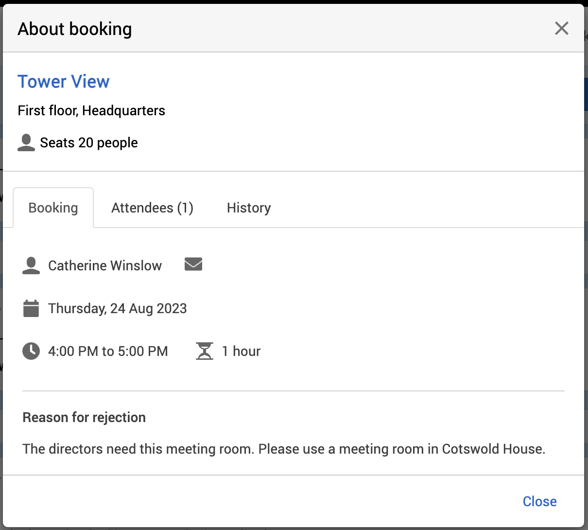 The About booking pop-up will appear with all the information regarding the rejected or cancelled booking.