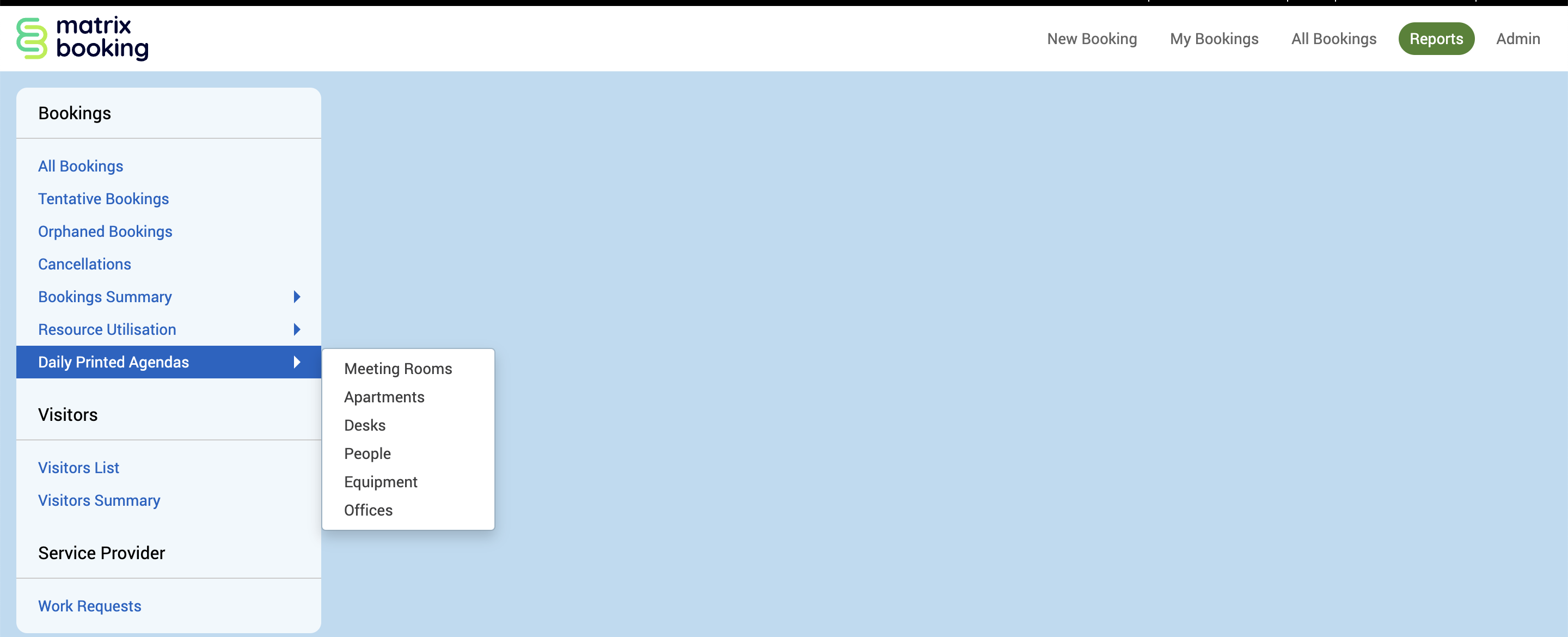 Select Daily Printed Agendas under the Bookings section in the side menu.