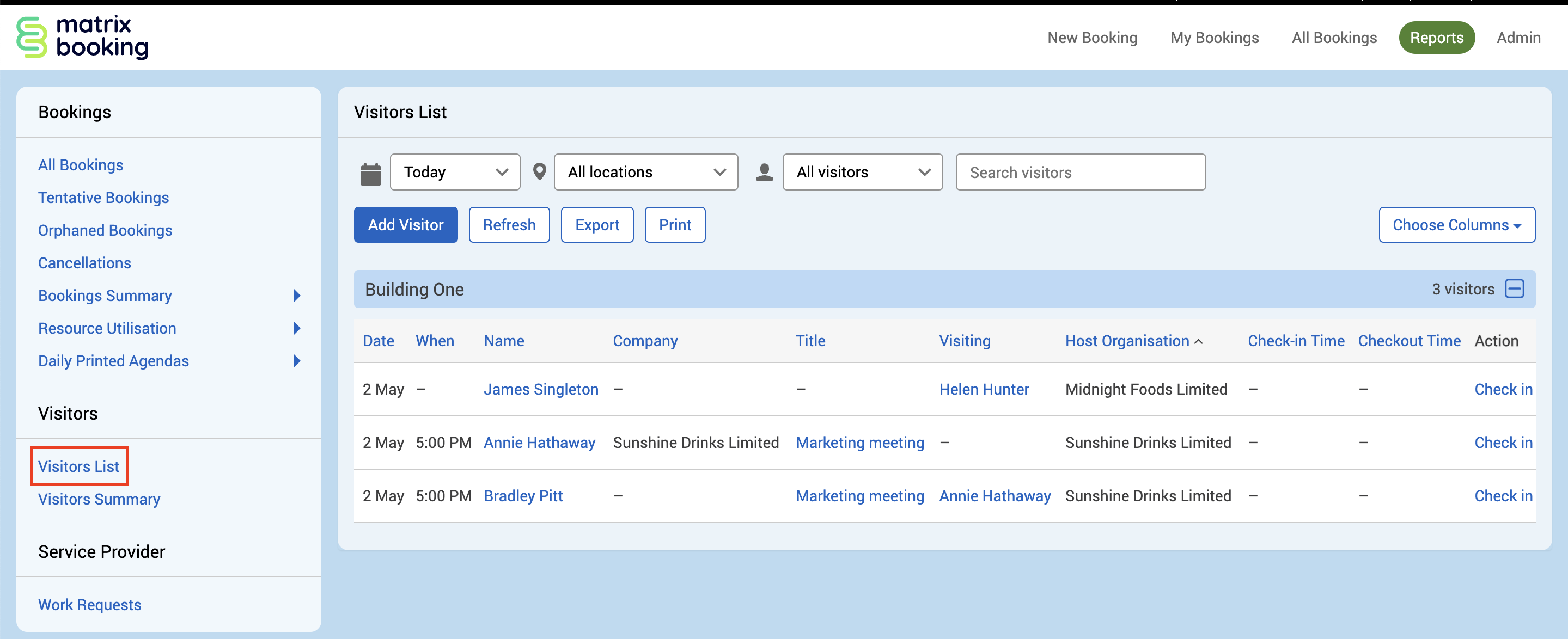 Once your shared reception has been setup, you’ll see a consolidated Visitors List report.