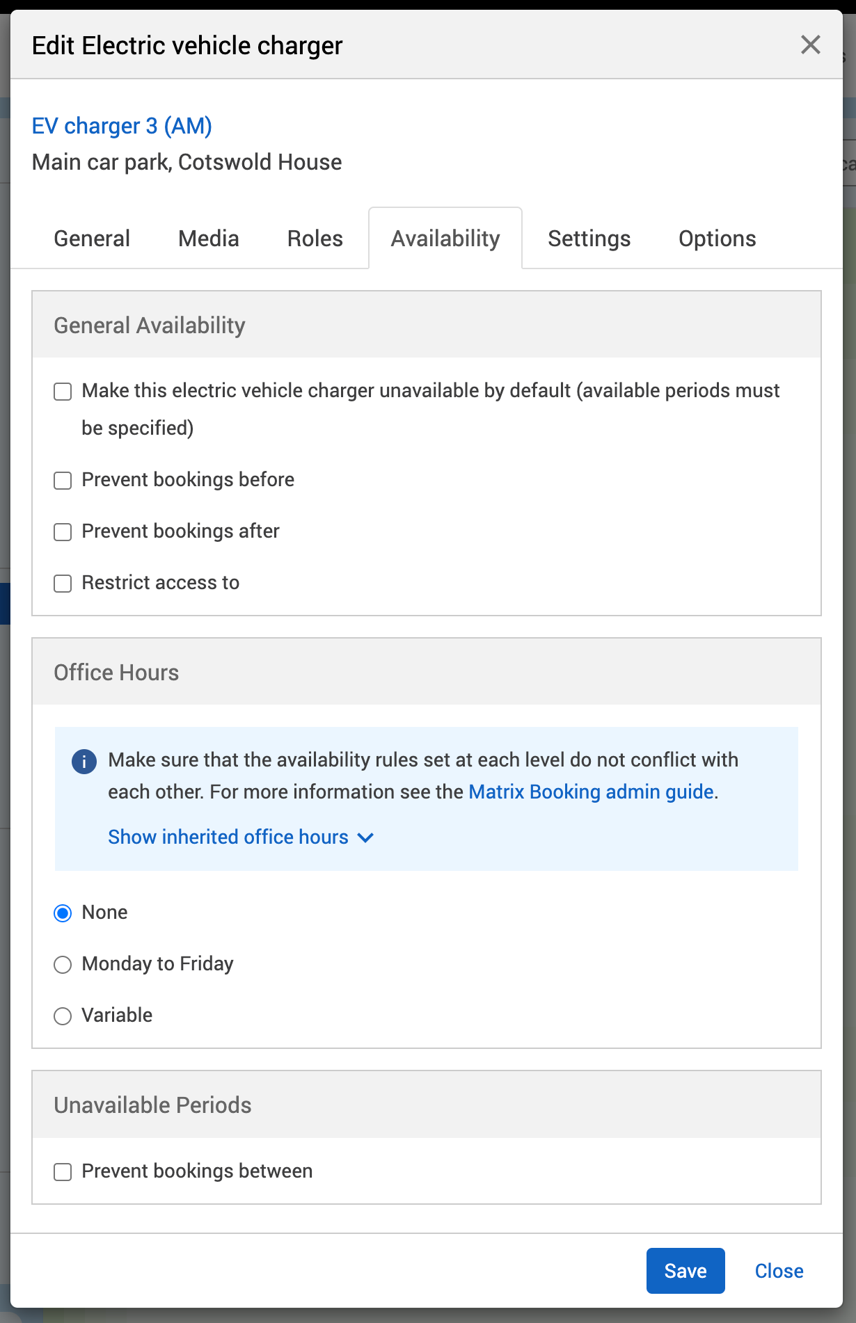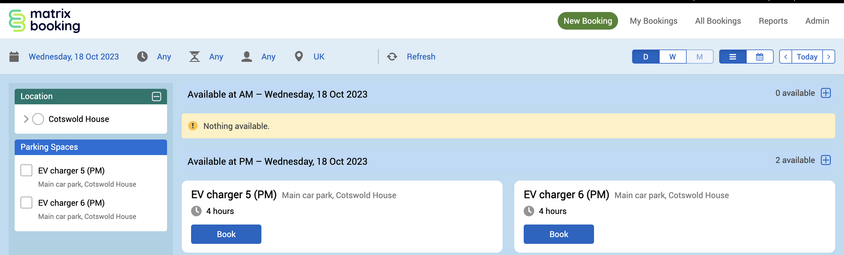 A resource schedule is a list of a type of resource your organisation has with different availability parameters set against each one. It helps users select the correct resource they need when they visit their place of work. For example, 1 person has travelled far to their office and needs to use a full day charger for their EV, whereas someone in the next town needs an afternoon charger for their small commute.