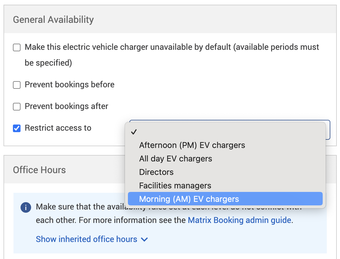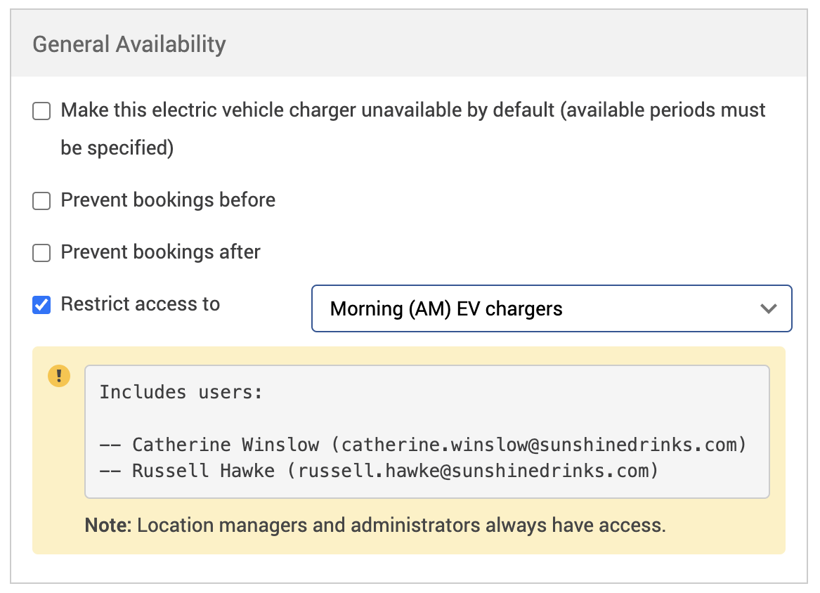 Optional: select the right user group from the drop-down list (for example, a morning EV charger should be restricted to the morning EV charger user group). The users in that user group will be listed at the bottom of the General Availability section.