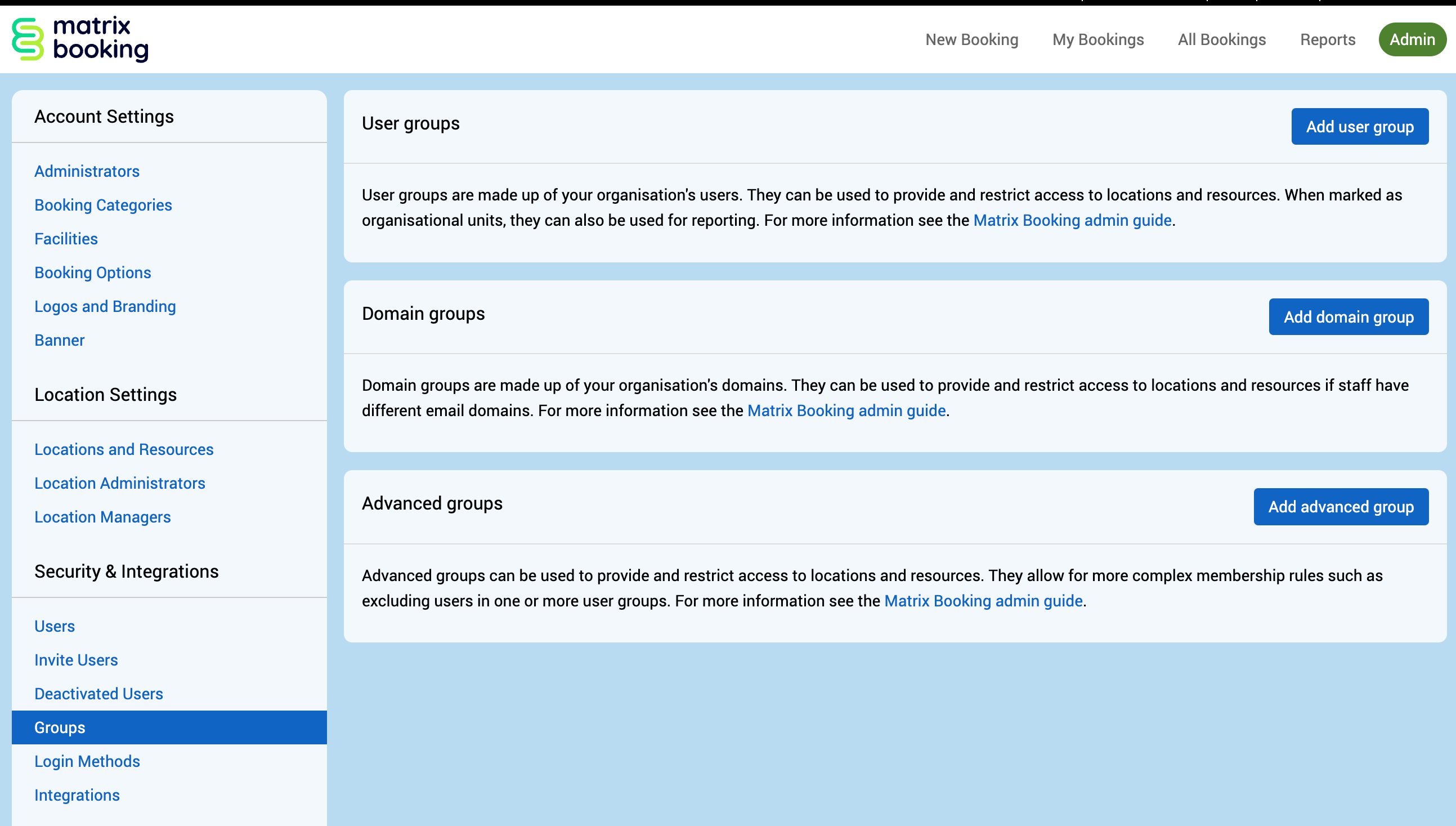 This page explains how to set up and manage user groups, domain groups, and advanced groups as well as how to restrict access to locations and resources for particular users. How the different groups are synchronised and our approach to security is also explained.