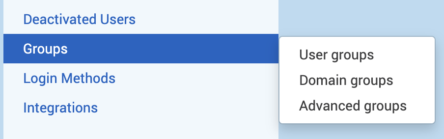 You can also hover over Groups and a drop-down list will appear with User groups, Domain groups, and Advanced groups. Selecting any of these drop-down list item will show a page for that group type only.