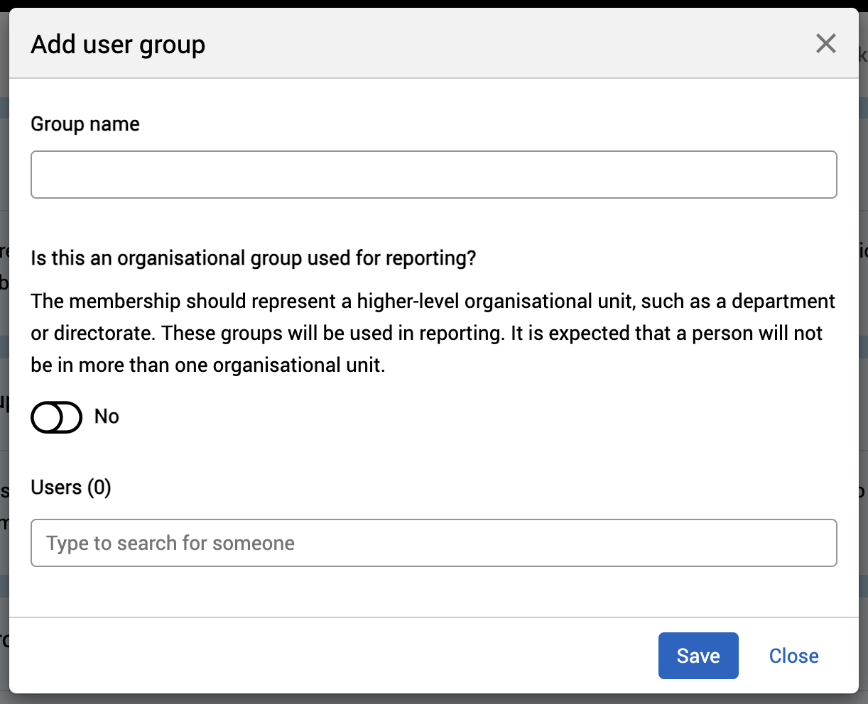 Select Add user group. The Add user group pop-up will appear.