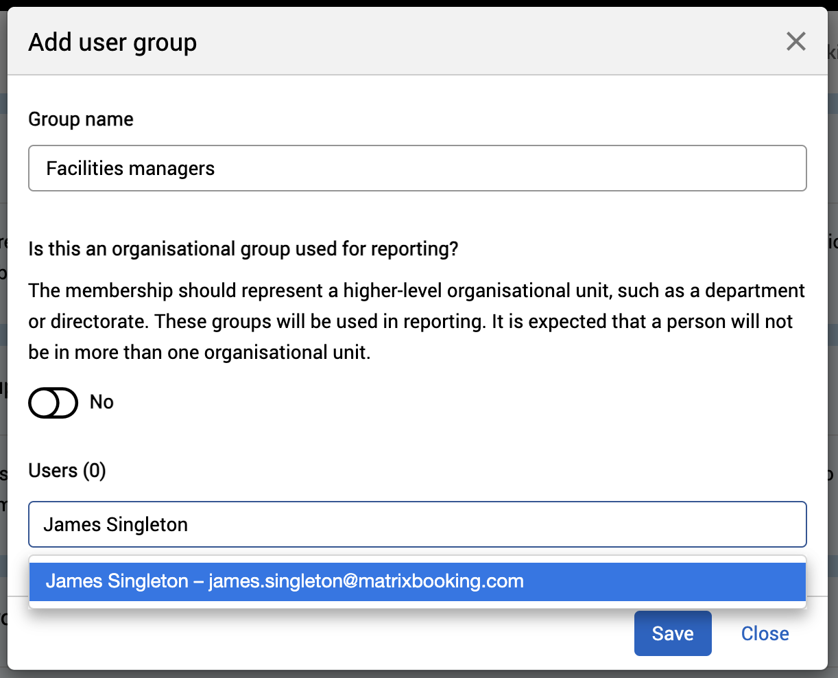 Warning: if a user doesn’t appear in the drop-down list, they aren’t registered with Matrix Booking. They can’t be added to any type of group until they’ve been registered.