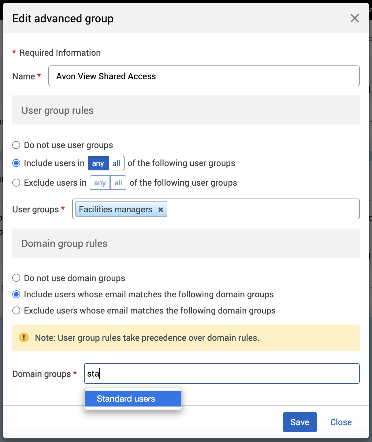 There are rules for including and excluding user and domain groups. For example, if we have 2 user groups added to an advanced group and you can: