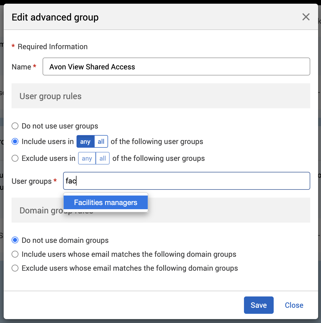 Begin to enter the user group name you want to include or exclude from the advanced group in the User groups text box. A drop-down list will appear.