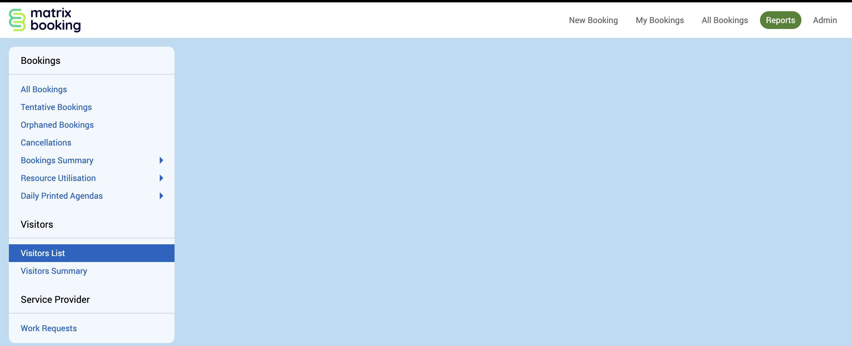 You need to create a reception in your resource hierarchy before making bookings with visitors. Bookings with visitors won’t appear in the report until a reception has been set up. All bookings that have yet to take place and have visitors will need to be cancelled and remade to include them in the report.