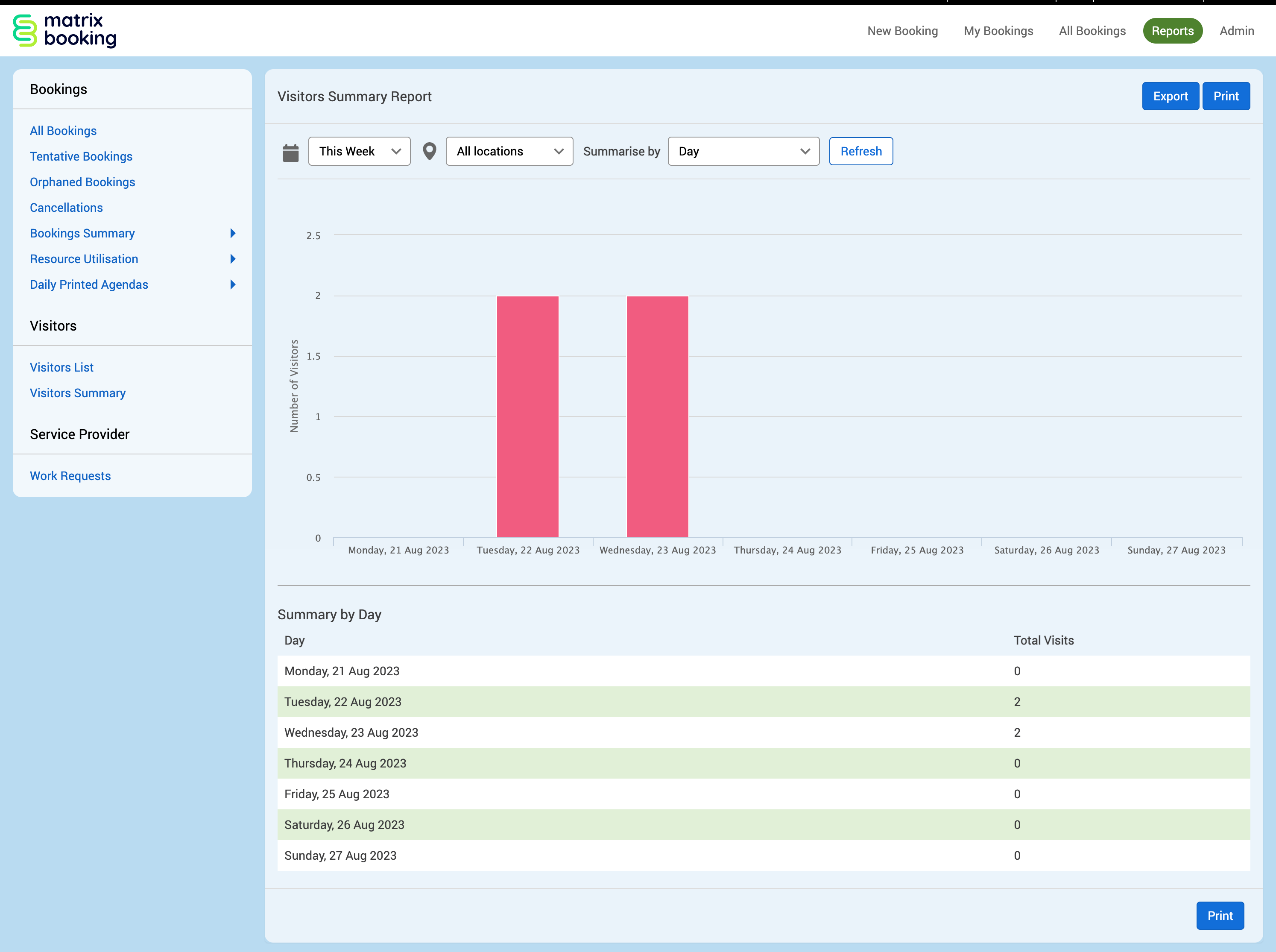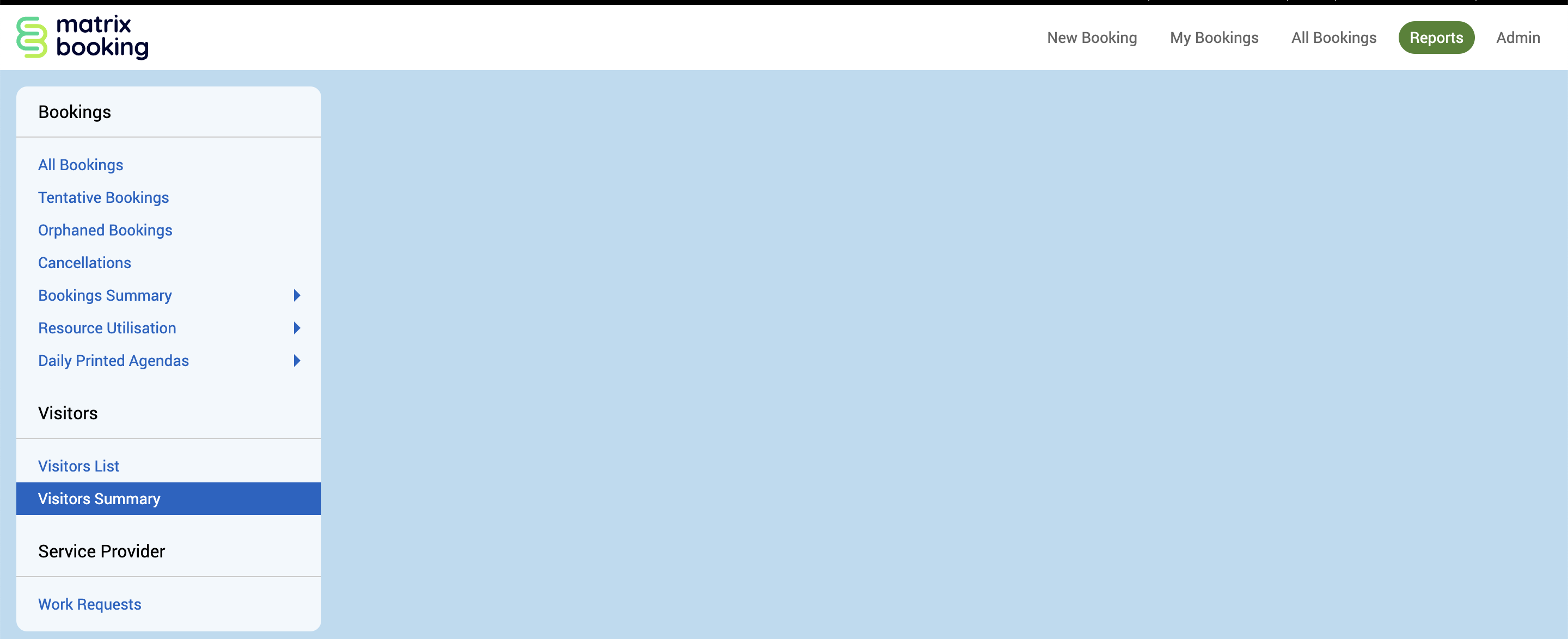 You need to create a reception in your resource hierarchy before making bookings with visitors. Bookings with visitors won’t appear in the report until a reception has been set up. All bookings that have yet to take place and have visitors will need to be cancelled and remade to include them in the report.