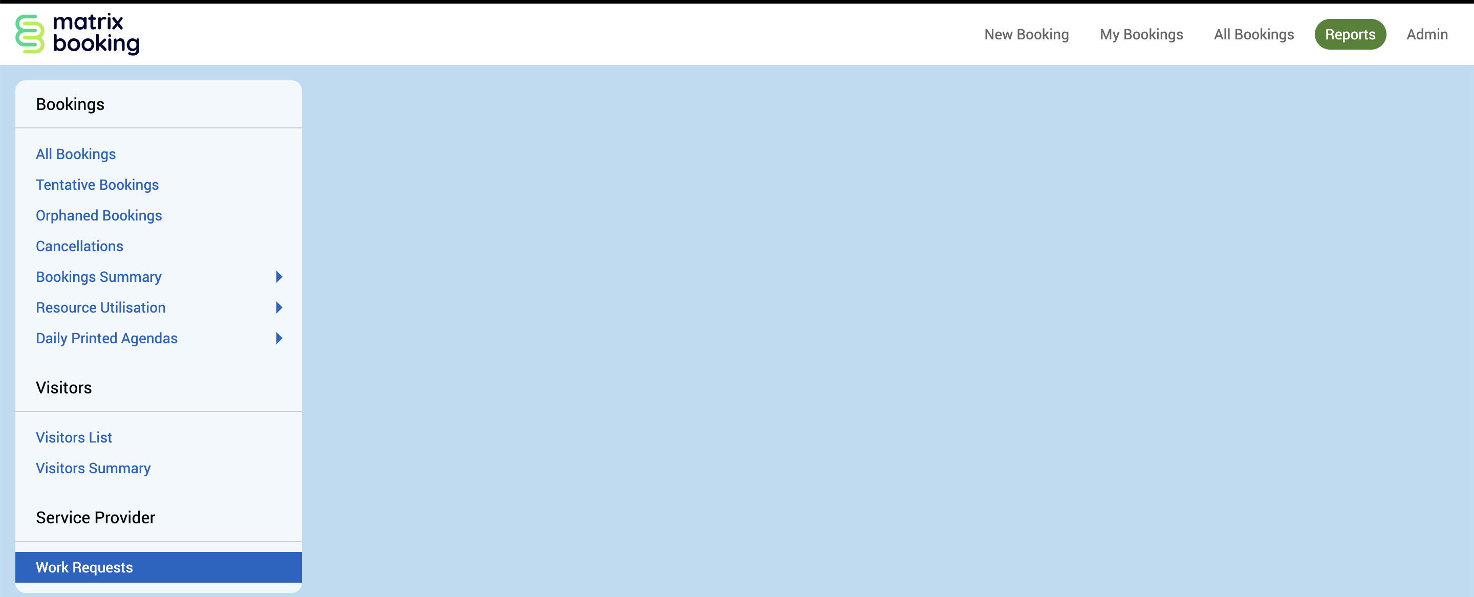 Select Requests in the top bar. The Work Requests report screen will appear.