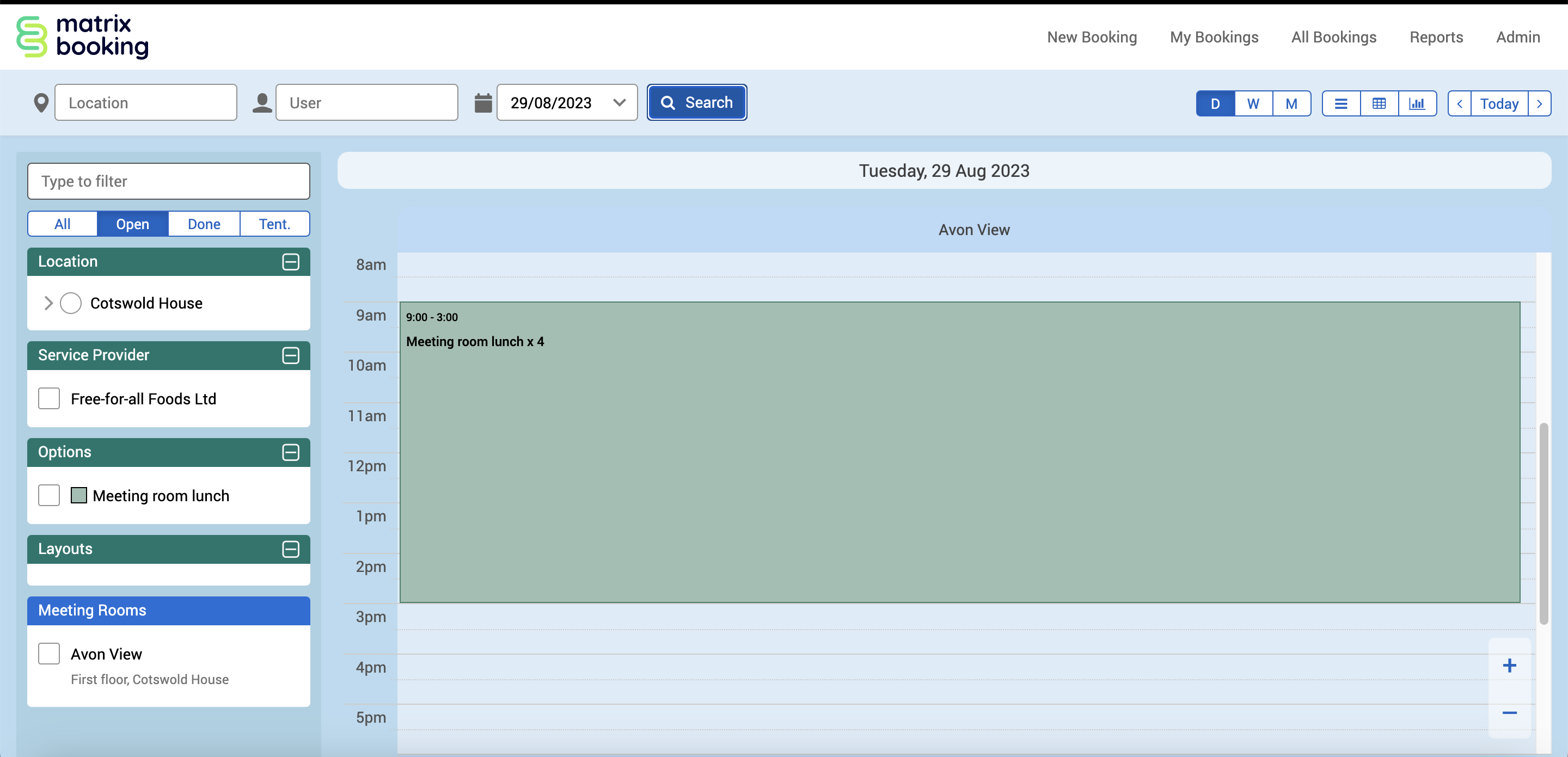 Select View by day to see all the bookings on a particular day. Today is the default.