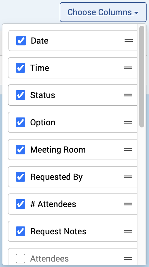 In the View as table, the full list of Choose Columns ▼ filters is as follows: