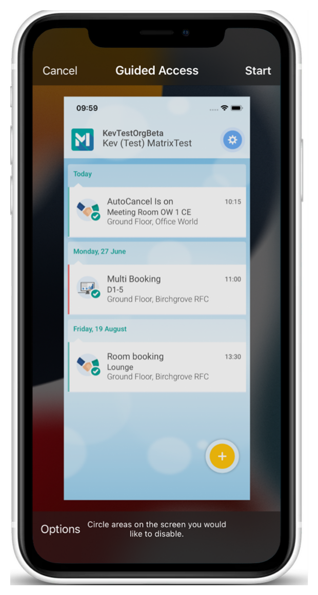 You have started a Guided Access session limiting your device’s access to the Matrix Booking app.