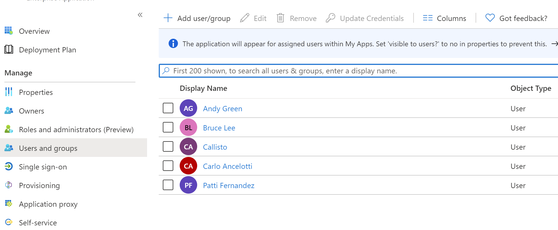 Go to the Users and Groups section of the Enterprise Application.