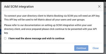 A message detailing the use of an API Key will appear. This is the key we use to allow requests to come from your SCIM Client to Matrix Booking and make requests on behalf of your organisation.