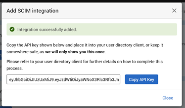 You have successfully added SCIM Integration to your organisation – you’ll be given an API Key in the text box.