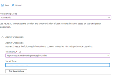 https://app.matrixbooking.com/api/v1/scimand the API key that you got when registered for SCIM Integration in Matrix Booking into the Secret Token box.