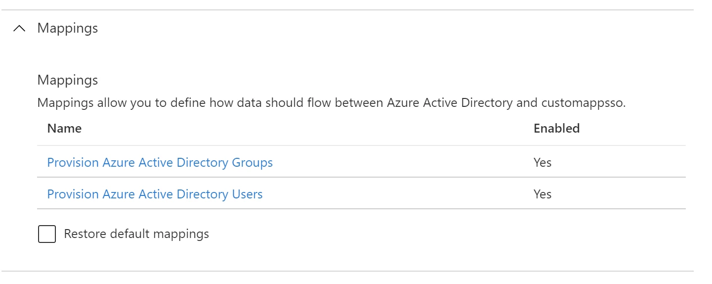 This will bring you to a provisioning settings page where below the Mappings header, you’ll see the Groups and Users Mappings links.