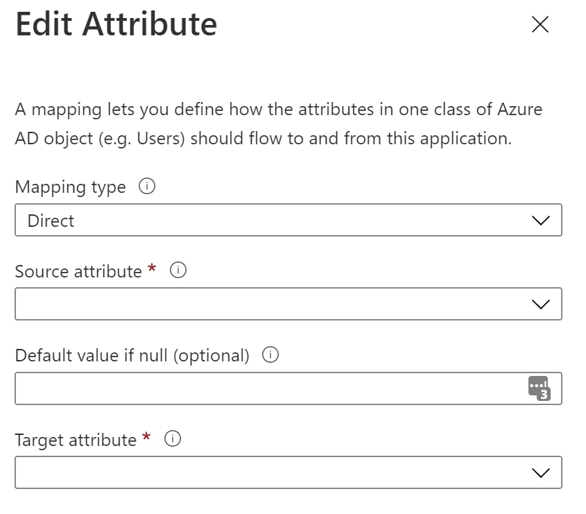 This will bring up the edit Attribute pane where you can choose the Entra ID Source Attribute, any default values you’d like to use, and the target attribute you want to populate.