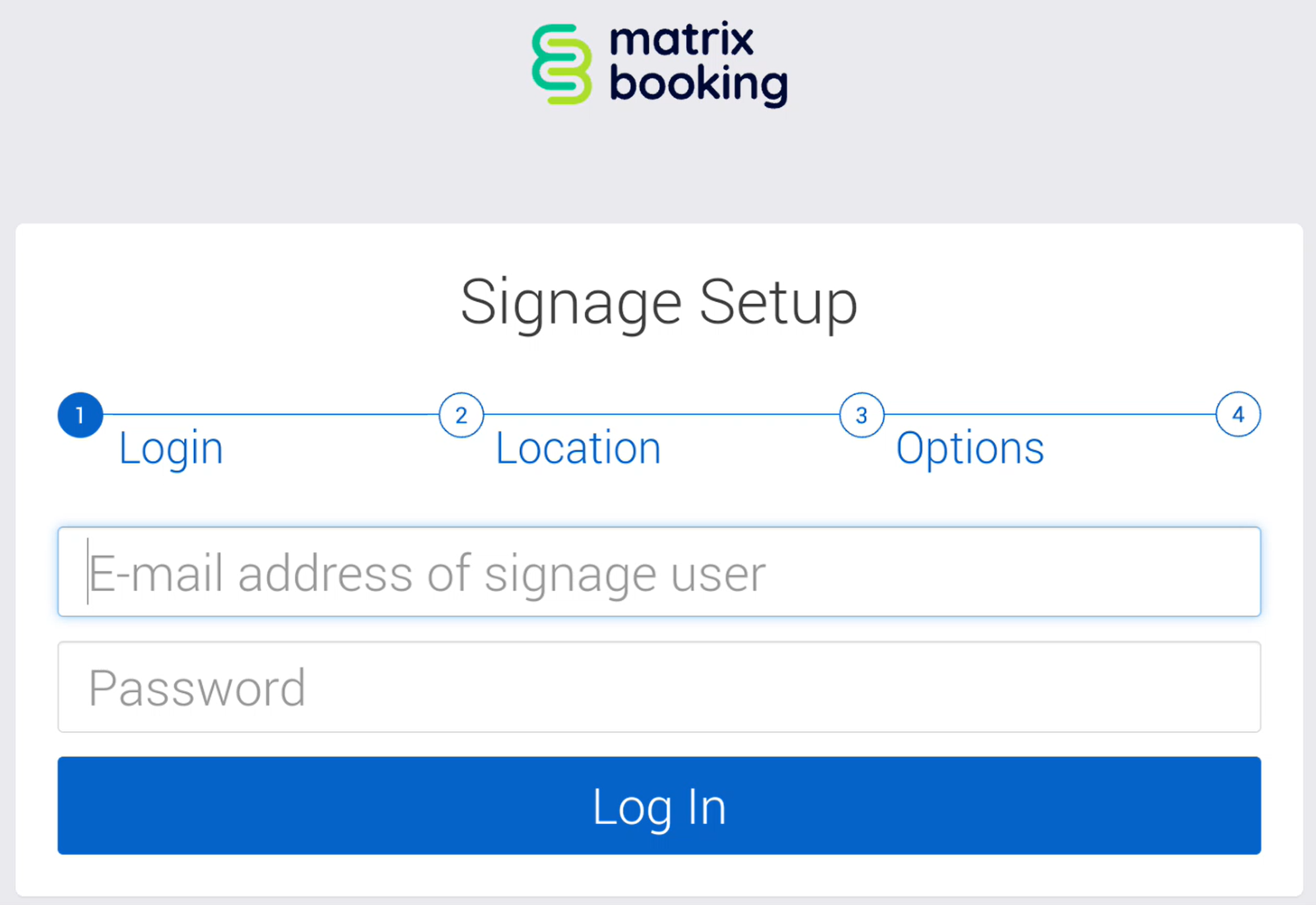Ask your Matrix Booking Administrator to create a system user to log in to the Signage app. If you’re doing this yourself, remember that this system user must also be given Location Manager level access to allow it to start and book the room on behalf of others.