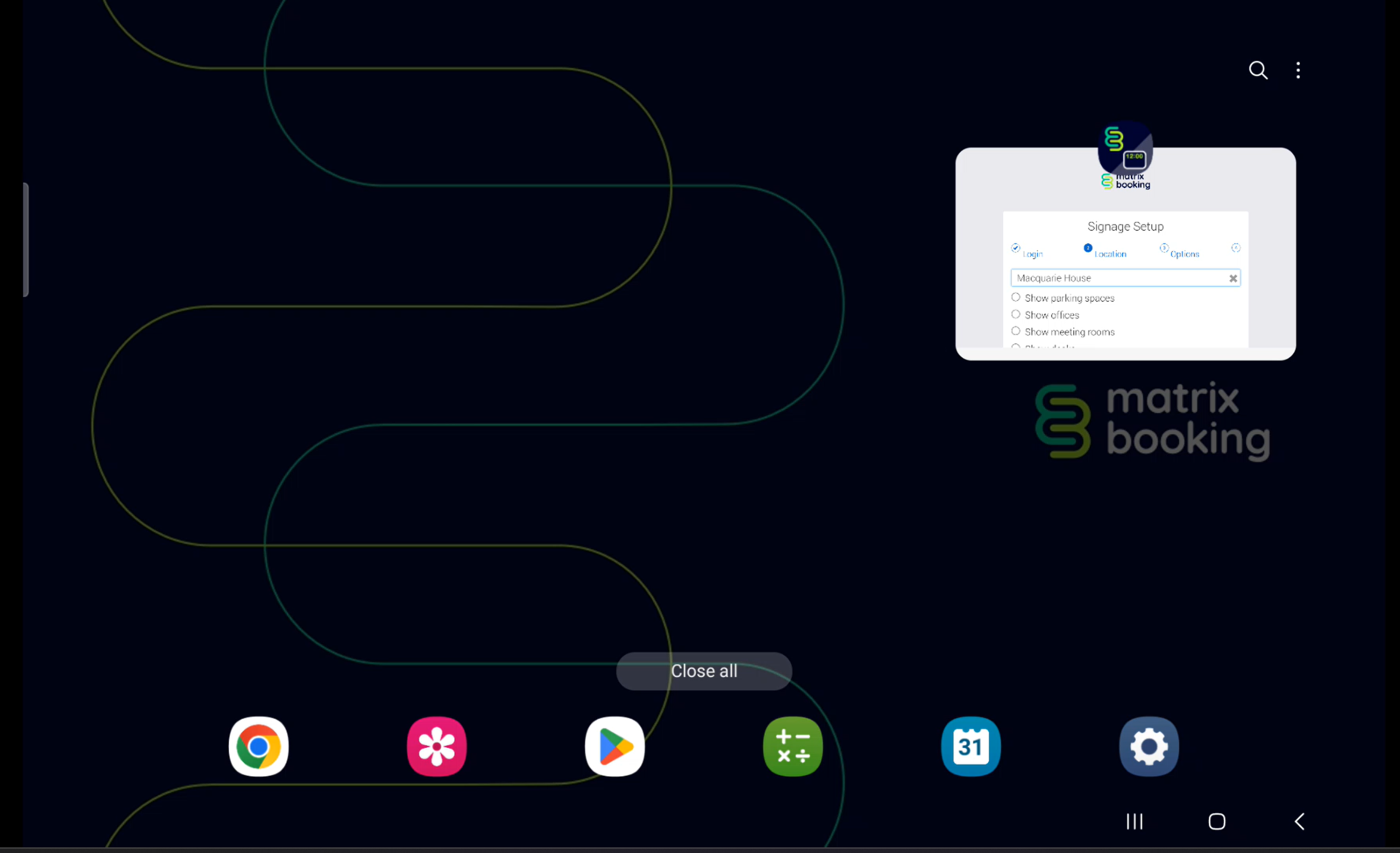 If you accidentally close the Signage app when doing this, tap the Matrix Booking icon again and it will relaunch and automatically login. Press the running apps button again.