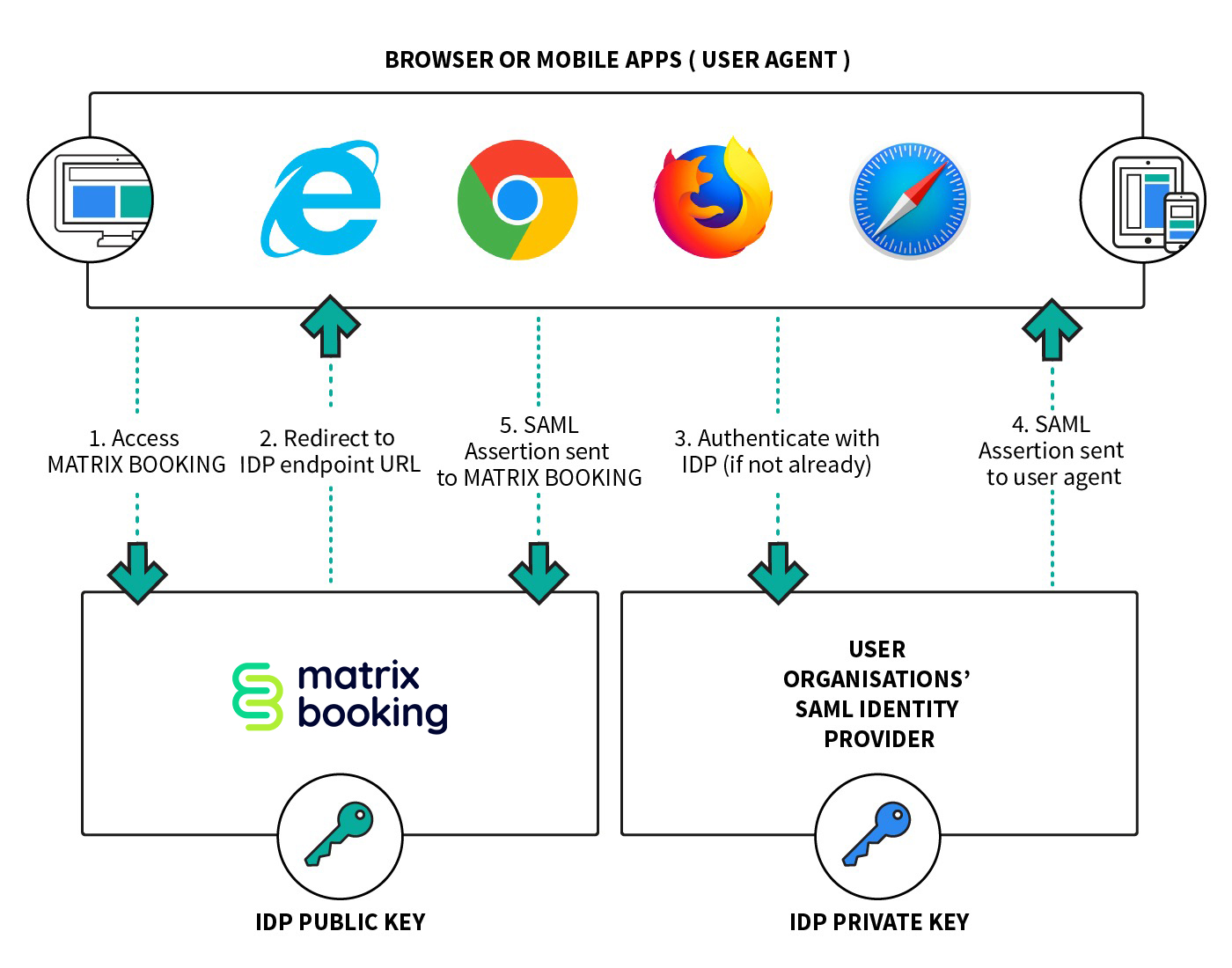 When implementing SAML-based SSO, Matrix Booking acts as the service provider (SP) that participates in authentication flow with your organisation’s identity provider (IdP). Matrix Booking supports both SP-initiated and IdP-initiated SSO flows.