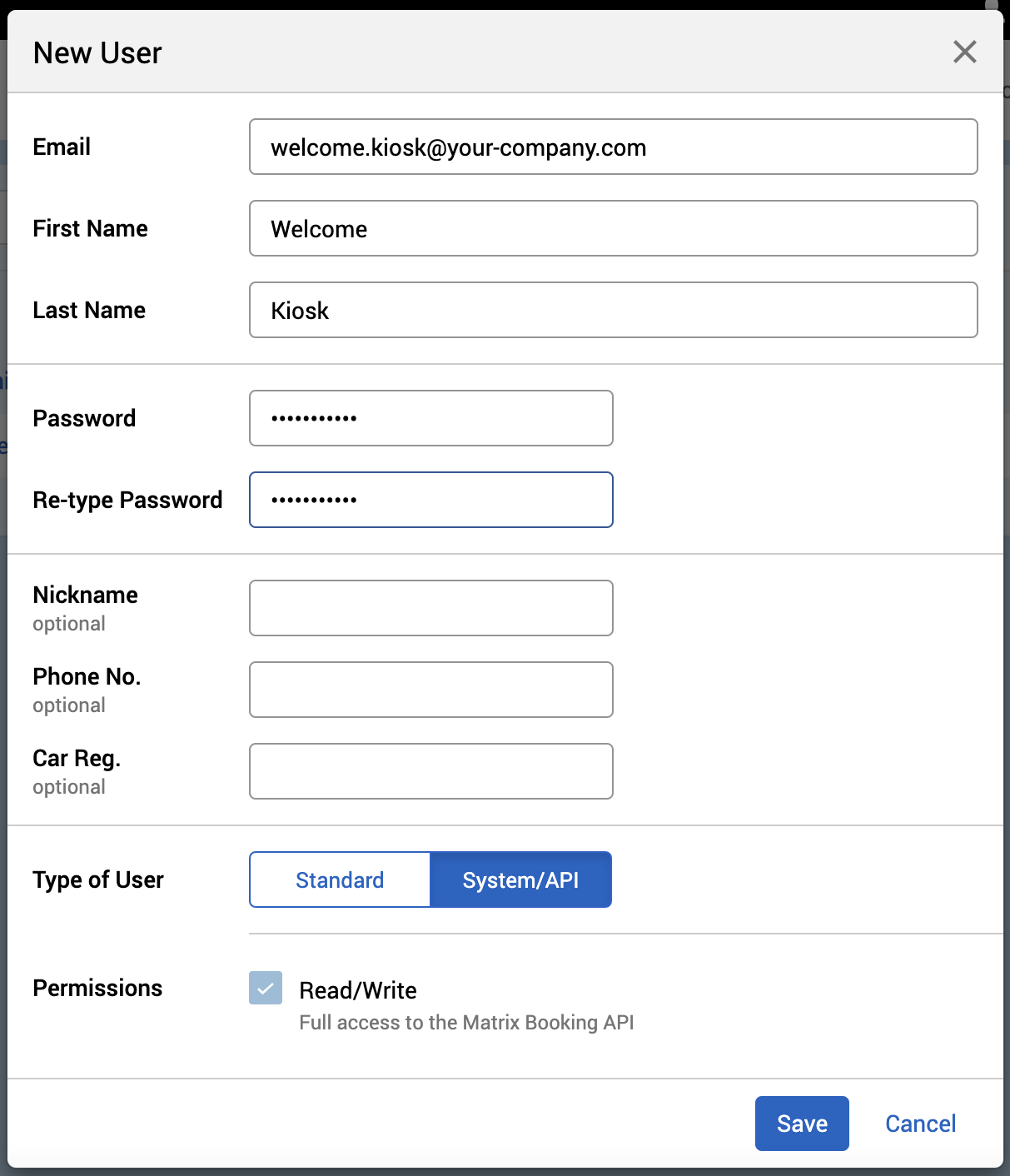 Note: your Welcome app’s user account must have the email domain @matrixbooking.com.