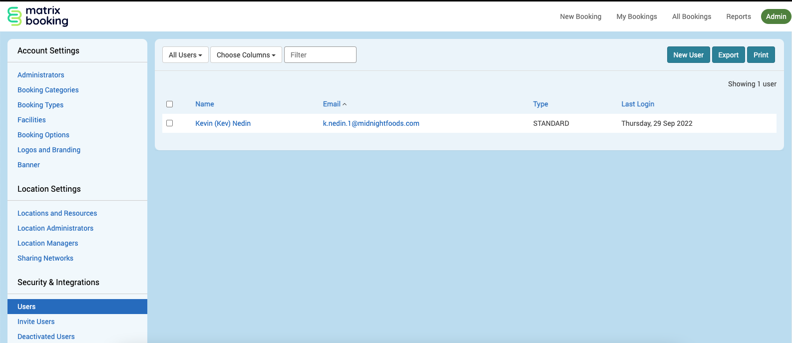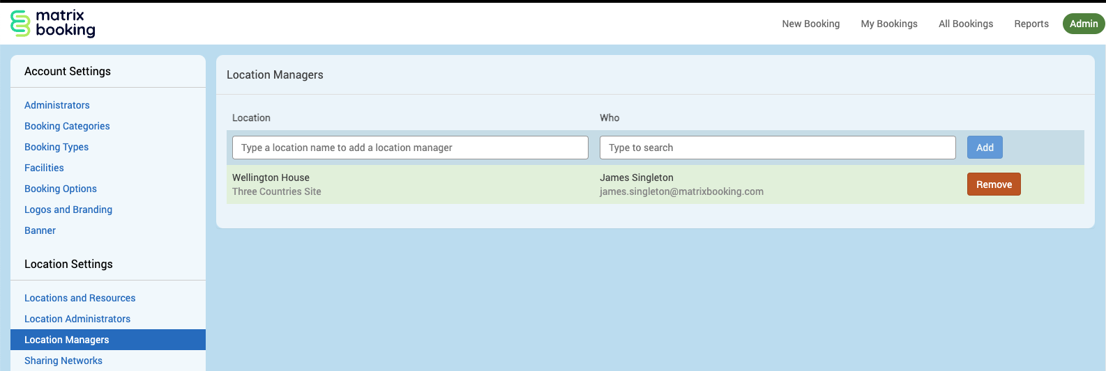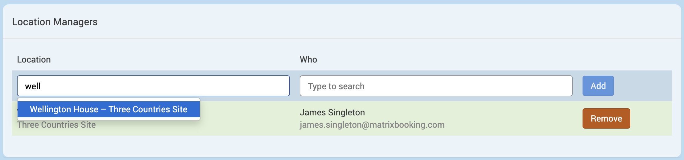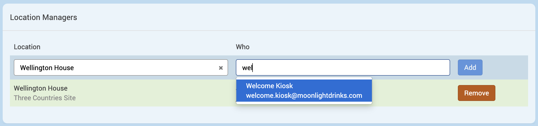 Once you have created the kiosk user, you must assign Location Manager access to the kiosk user for (at least) the office location that you’re setting up the Welcome app for. This will give the kiosk user permission to check visitors in and out of the location. To do this in the Matrix Booking web app: