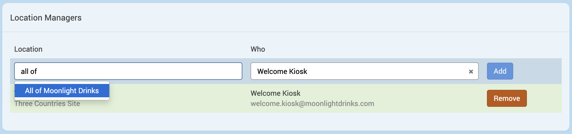 Alternatively, begin to enter “All of …” to assign Location Manager access to the kiosk user for all locations.